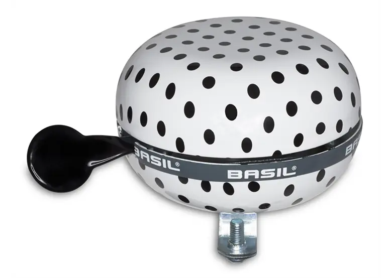 Dzwonek rowerowy Basil Big Bell Polkadot posiada ciekawy design w kropki. Model jest łatwo mocowany na kierownicy i duży, aby dźwięk był donośny i lepiej słyszalny w miejskim tłoku.